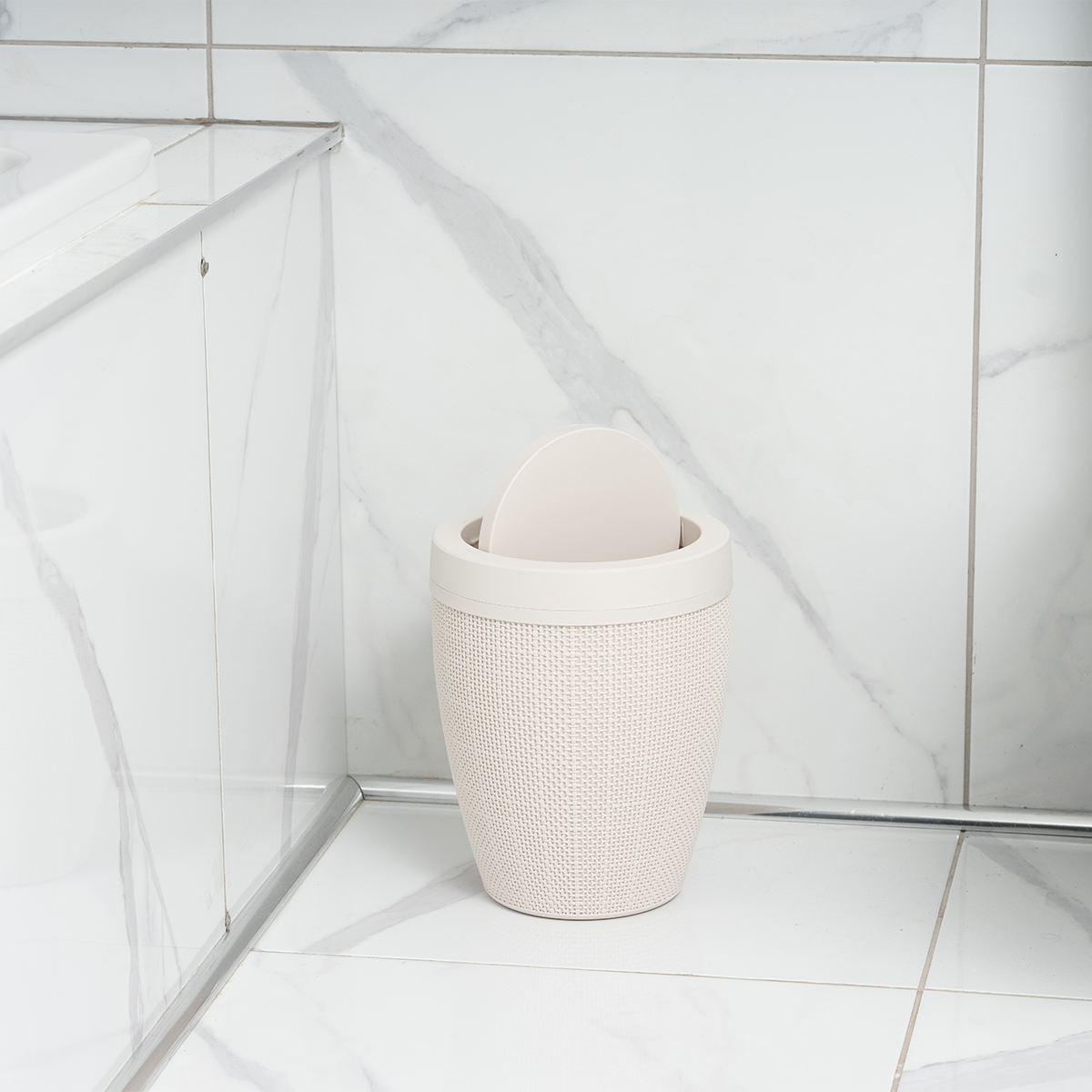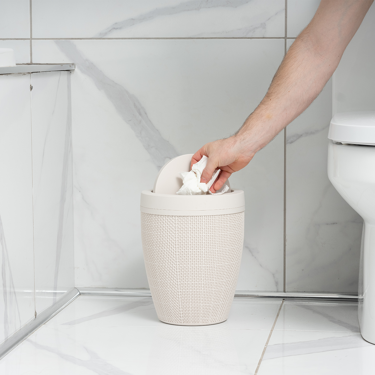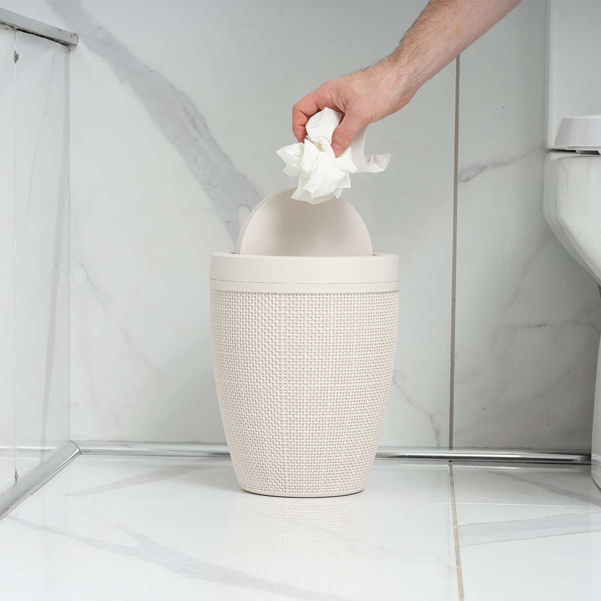 Het compacte afvalbakje met klapdeksel biedt slim gebruiksgemak met een natuurlijke vormgeving. Dankzij het kleine formaat vindt het moeiteloos een plek in de toilet, badkamer, slaapkamer, op kantoor of op het aanrecht. De klapdeksel houdt afval netjes uit het zicht en helpt geurtjes te verminderen.
