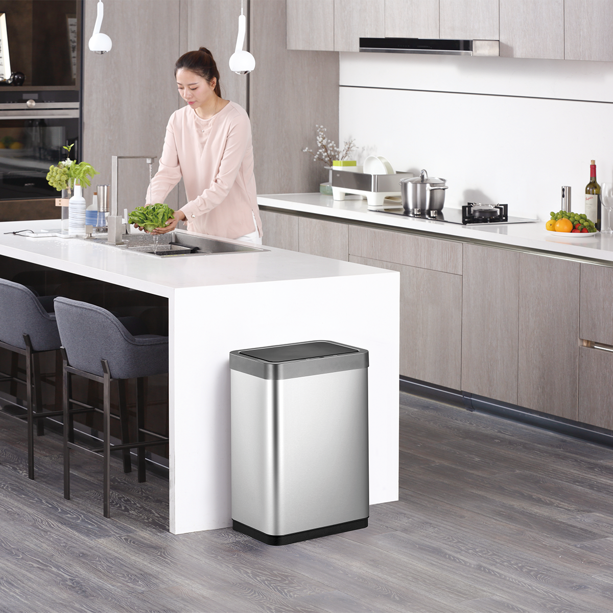 Het geavanceerde sensormechanisme en het dynamische display maken de bediening intuïtief en moeiteloos. Het deksel opent en sluit automatisch en geruisloos, waardoor je handen vrij blijven en je de bak op een hygiënische manier kunt gebruiken. Het afneembare deksel zorgt ervoor dat het verwisselen van de afvalzak snel verloopt.